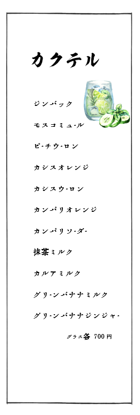 | 営業時間 | 18:00~24:00(L.O 23:00) |