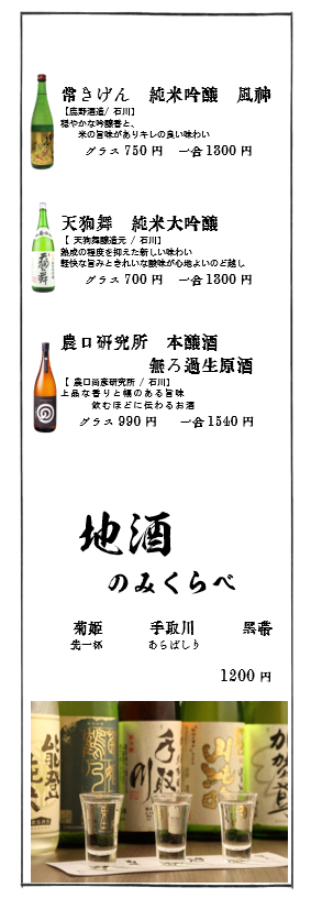 | 席数 | 1階ー:カウンター17席(秘密の4席あり)、テーブル8席 中二階:6席 2階:ー個室1室8席、テーブル席36席 |
